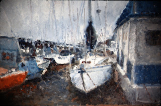 Cement, original Betker oil on canvas, Seattle’s Harbor Island, industrial-recreational marina